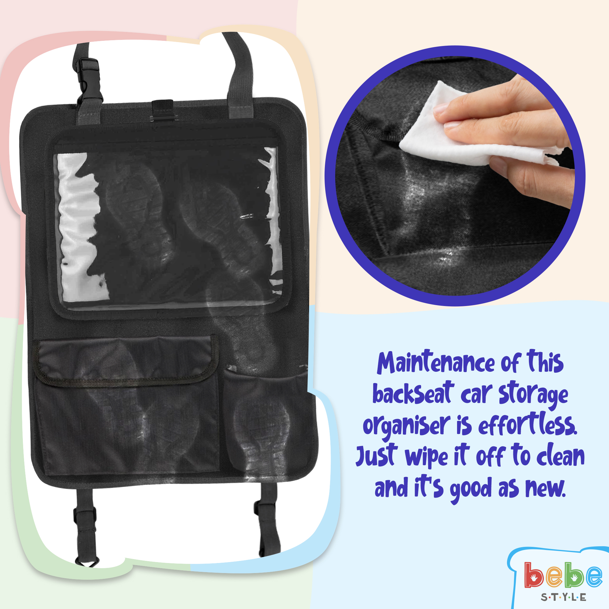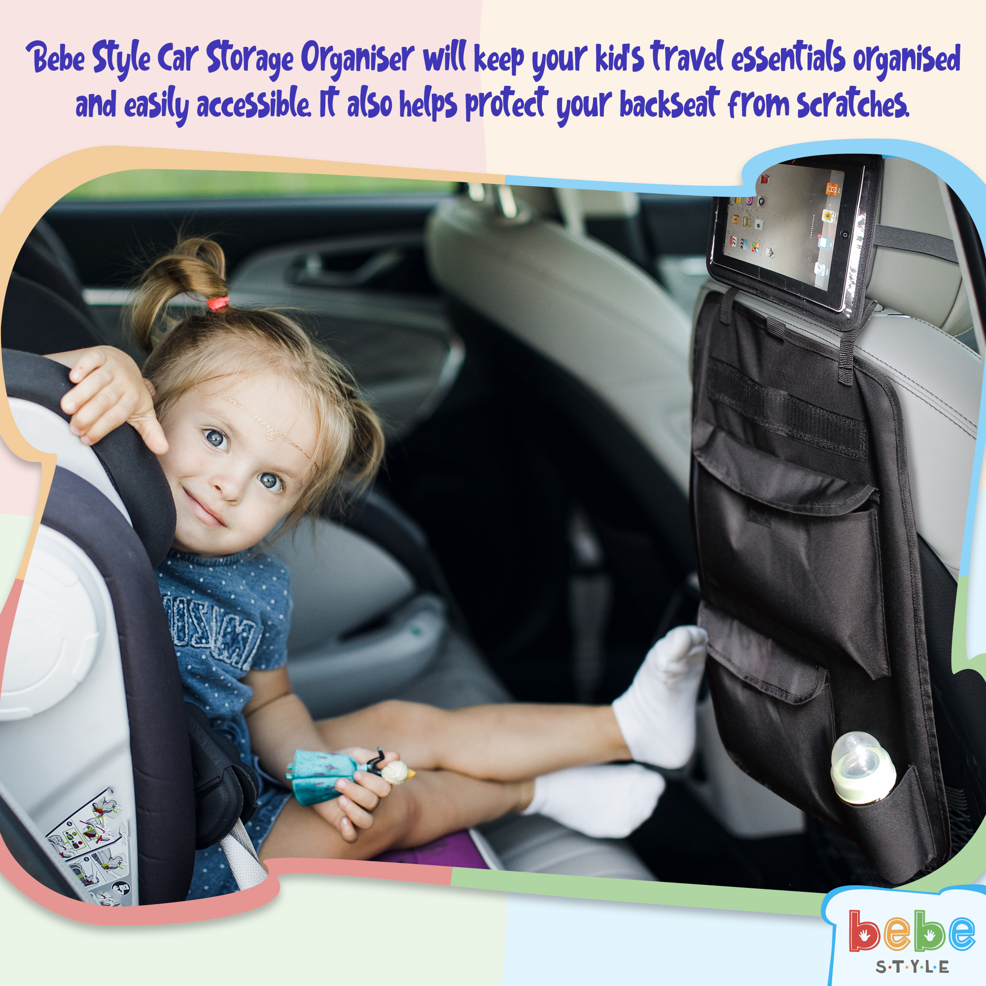 Parents in today’s world need convenience, accessibility and functionality for all things kid-related. Bebe Style Backseat Car Organiser with Tablet Holder is versatile, dependable, and easily adjustable to any make and model car. It can store things like bottles, diapers, stuffed animals, snacks, wipes, sippy cups, and even clothes. The clear PVC window enables excellent touchscreen workability without having to remove the tablet from the holder.